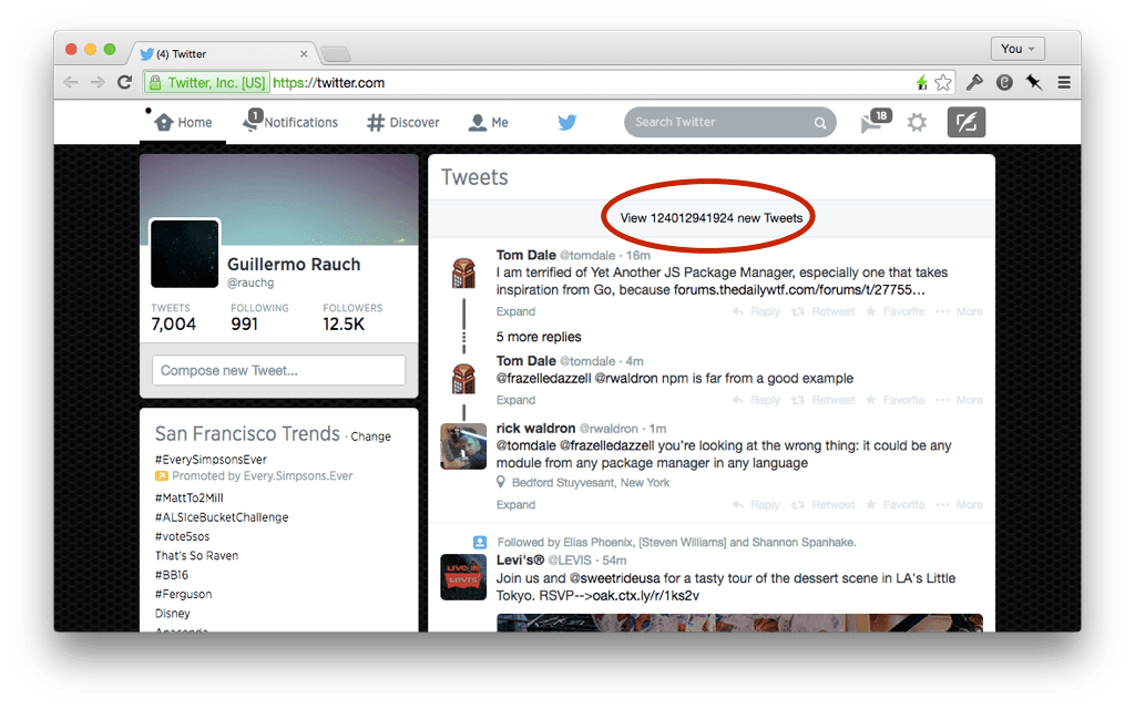 The ability for your application to reconcile states disjointed in time is also relevant to our first principle. If you opt to send data with the initial page load, you must consider the time the data is on the wire until your client-side scripts load. That time is essentially equivalent to a disconnection, and the initial connection by your scripts is a session resumption.